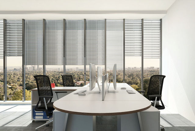 Modern office with triple workspace design with large view windows and blinds. We measure, supply and install!