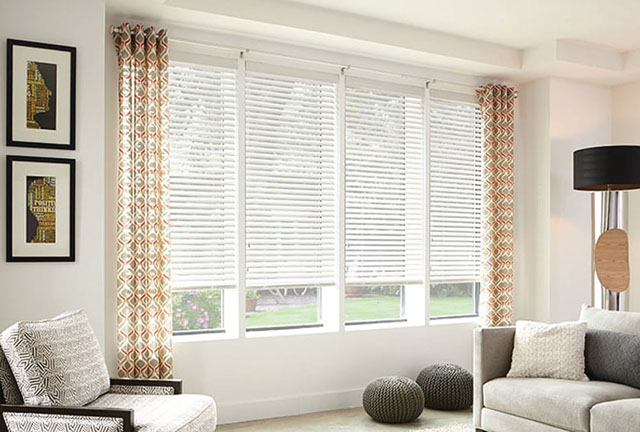 Custom Wood blinds come in light neutrals, white, off white, and soft taupe. Get in touch for a free estimate!