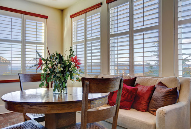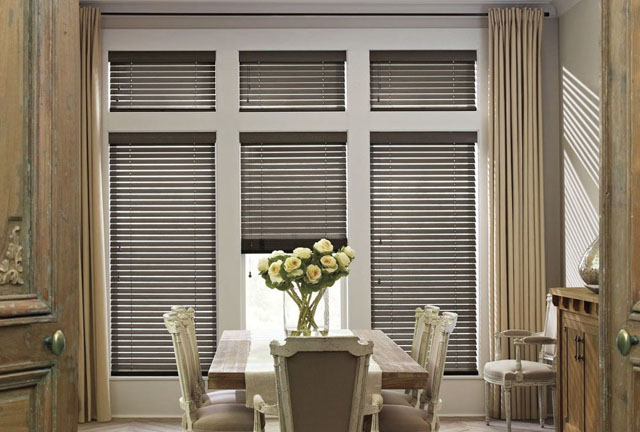 Beautiful dining area with off white Wood blinds. They offer pure elegance and a sense of luxury in the space.