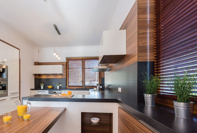 Kitchen gets transformed with our customized Wood blinds. They create a warm effect for all family gatherings.