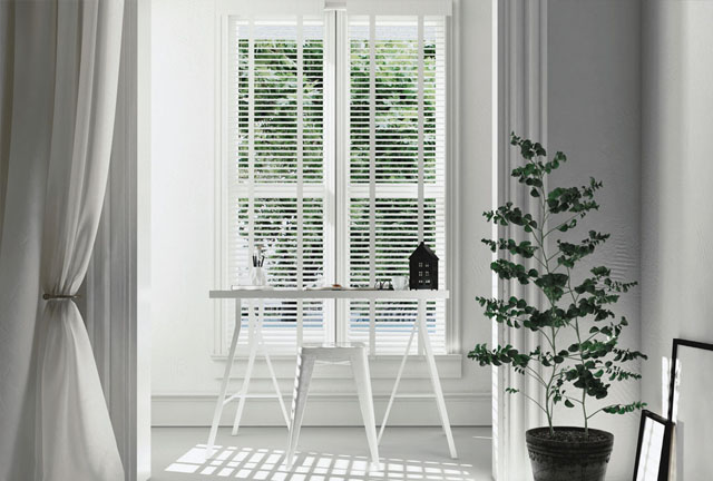 Fresh white home office interior with beautiful Wood blinds. a perfect choice as they are ageless and long lasting.