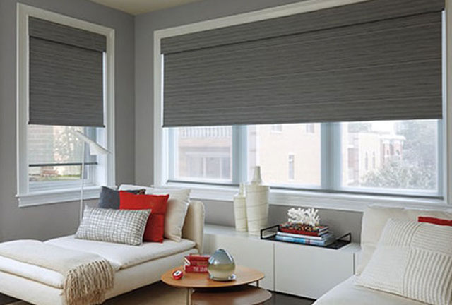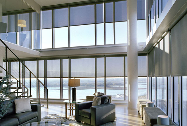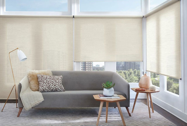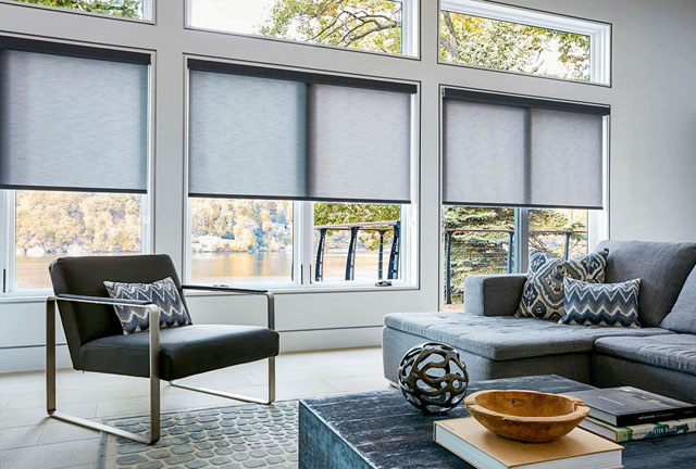 Our motorized Roller shades are a great choice for rooms with multiple windows. This flat makes a prefect example!
