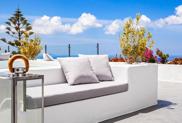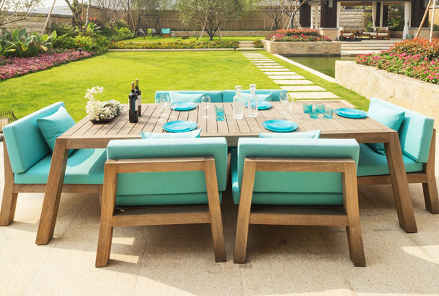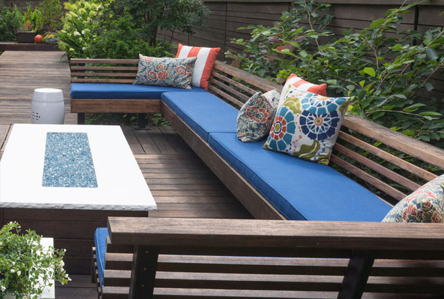 A contemporary outdoor conversation bench with pillows on a wooden deck. The different cushions create color contrast.