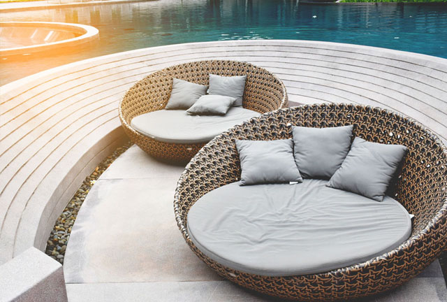 Relaxing rattan chairs with pillows beside the swimming pool. Perfect way to create the most relaxing place!